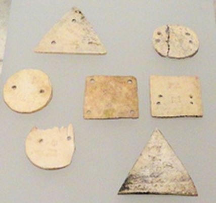 However, Lynne showed us archaeological examples from the Iron Age onwards (right) which are also triangular or round, and many, even the square ones, often have more than one hole. As she noted, there has been little attention paid to the reasons for this variety of shapes, or to the implications for weaving and resulting products.