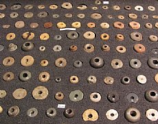 Our main evidence of spinning comes from spindle whorls found on prehistoric and modern sites. They come in a variety of materials, shapes and sizes. The wooden spindles rarely survive. This picture shows just one drawer of the many spindle whorls held in the National Museums of Scotland.